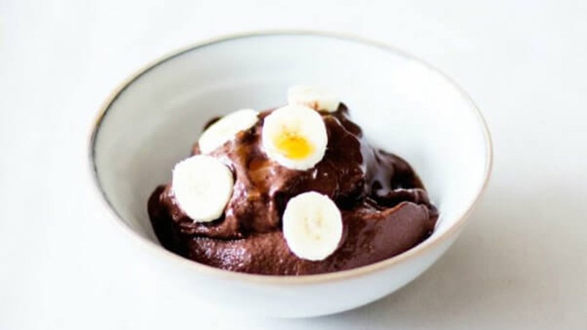 - In a blender or food processor, combine the frozen banana chunks, dates, almond butter, frozen cherries, cocoa powder, vanilla extract and unsweetened soy/nut/almond or hemp milk. Blend until smooth, thick, and creamy. (If having trouble blending, you may need to let the frozen banana chunks soften a bit.)