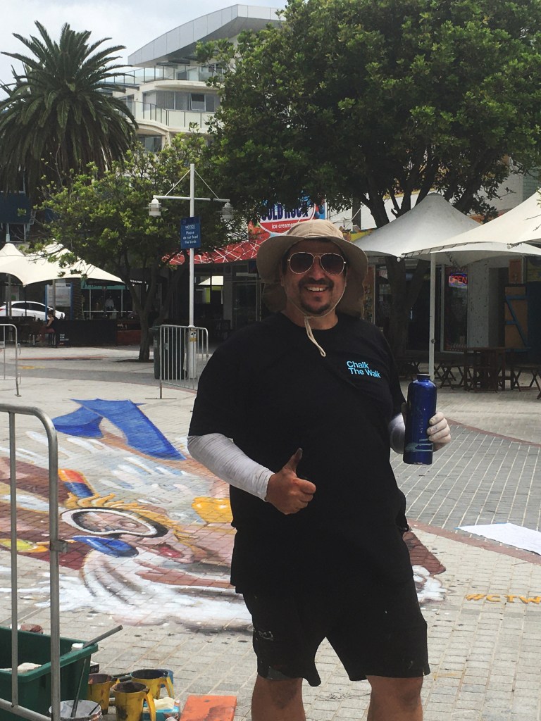 Chalk the Walk Street Art Festival artist: Anton Pulvirenti at work on a 3D interactive painting. Location: Waterfront Plaza, The Entrance, NSW Australia. Anton’s artwork can be found on Instagram & Facebook – The following image is Anton’s interactive 3D artwork (with ‘live’ Pelican) completed Friday 21st February 2020.