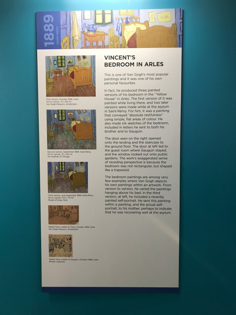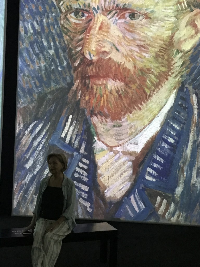 Have you experienced this type of art exhibition? It truly transported me as I’ve never experienced before. All my senses came alive simultaneously. All my loves intertwined, as it were. The music, the stillness, the almost rapture of witnessing Van Gogh’s various forms of technique throughout his painting life; with many of his quotes dripping tenderly here and there delicately recreating his life. It was fantastic.